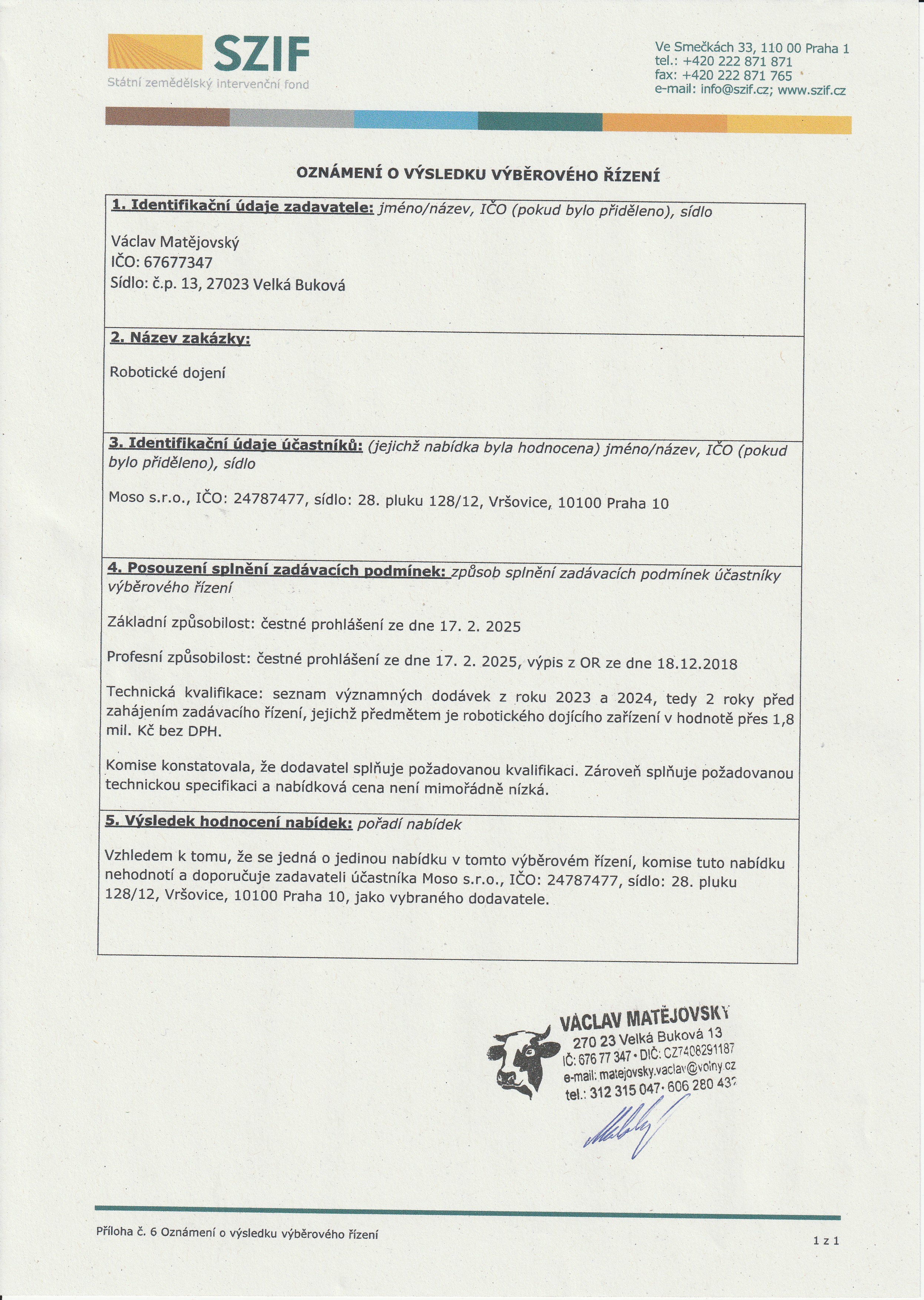 Předmětem veřejné zakázky je dodávka robotického dojícího zařízení.
